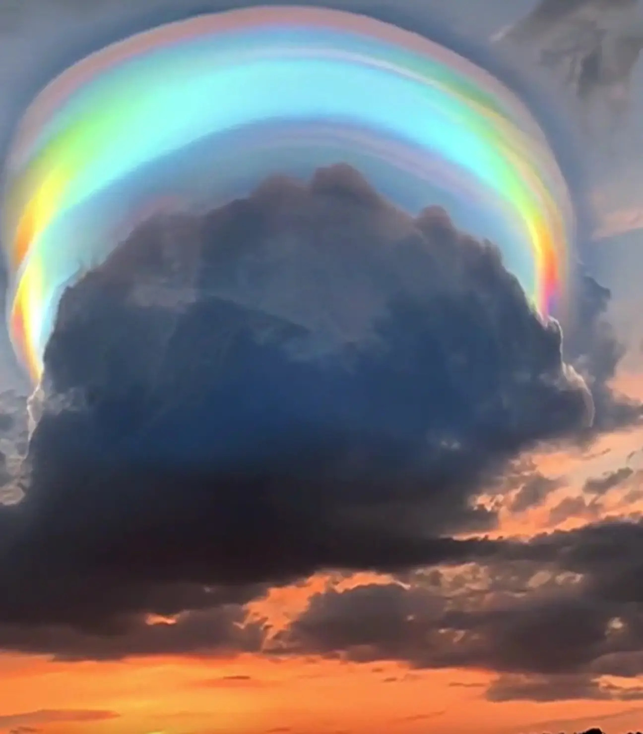▼8月21日下午,海南省海口、澄邁、臨高等地的不少網友拍到了天空中的彩色雲朵。這種現象被稱為「彩虹襆狀雲」。「彩虹」是陽光照射到半空中的水滴,光線被折射、反射,在天空中形成拱形的七彩光譜。而「襆狀雲」往往出現在濃積雲的頂部,就像一頂帽子,「襆」是中國古代男子用的一種頭巾。